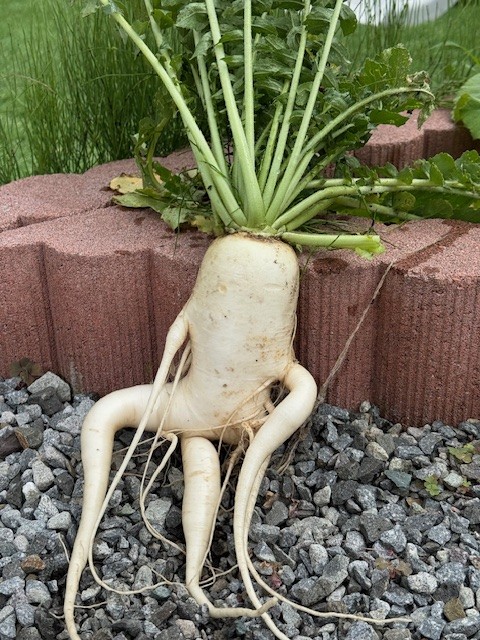うちの庭で育てた大根が、すごくユニークな形で収穫されました!